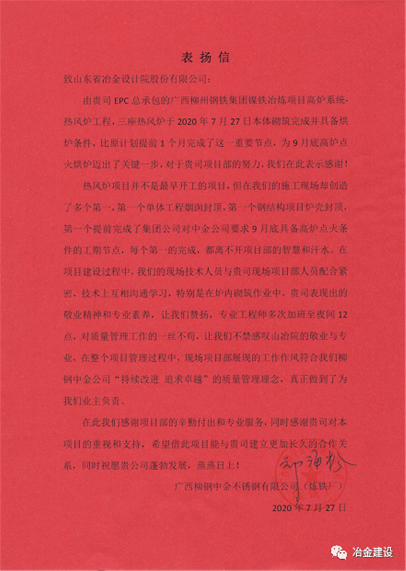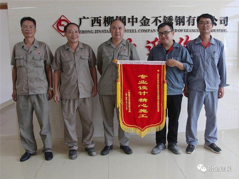 就是憑著這股韌勁和山冶設計“敢打硬仗、一切為用戶著想”的精神,柳鋼中金熱風爐工程的各項工作推進順利,并多次在安全、質量、進度大例會上受到表揚。在27日砌筑封頂之后,上午柳鋼中金煉鐵廠送來表揚信,對現(xiàn)場項目部的工作給予了肯定,下午柳鋼中金公司副總經(jīng)理張洪波授予了現(xiàn)場項目部“專業(yè)設計精心施工”的錦旗,盛贊山冶設計專業(yè)、敬業(yè)!