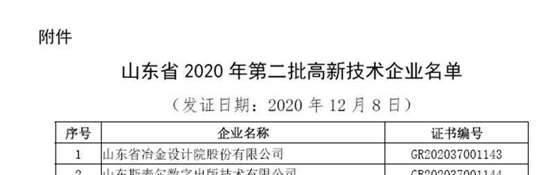 1月15日,根據全國高新技術企業認定管理工作領導小組辦公室印發的《關于山東省2020年第二批高新技術企業備案的復函》,公司順利通過了2020年度國家高新技術企業認定。