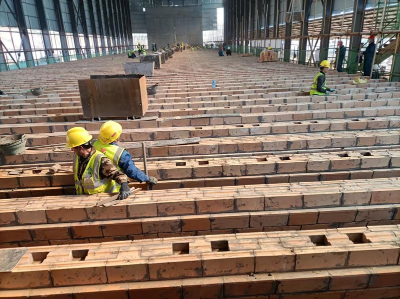 云煤能源焦化升級項目建設的7.6m頂裝焦爐,2座焦爐用磚量7萬噸,磚型多達1000多種,磚型復雜,對耐材生產供貨及管理要求很高,公司領導在耐材訂貨時就高瞻遠矚十分重視、派遣數(shù)位人員駐廠監(jiān)制,云煤焦爐砌筑工期十分緊張,加上現(xiàn)階段國內新建焦爐較多耐材供應本就較緊張,以及受疫情以及冬奧會影響,生產供應更加困難。云煤1#焦爐砌筑時間與山冶負責設計與項目管理的山西盛隆泰達項目砌筑時間相近,且粘土磚生產廠家均包含濟源耐火爐業(yè),粘土磚供應保障壓力極大。為了保證砌筑進度,云煤項目部積極協(xié)調各方、千方百計保證耐材供貨以滿足砌筑需求。一方面派遣專業(yè)工程師駐廠催交監(jiān)制,另一方面協(xié)調其他耐材生產廠家協(xié)助粘土磚生產保供應。項目管理分公司負責耐材管理的石景林,每天不辭辛苦聯(lián)系廠家發(fā)貨、溝通到貨時間、協(xié)調施工方卸貨,晚上還要統(tǒng)計每天10~20車數(shù)百個磚號的到貨量。在耐材砌筑質量管理方面,我們外聘了2位有豐富施工與砌筑經驗的老同志,為焦爐砌筑施工質量保駕護航。