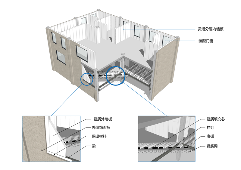 隱梁裝配式鋼結構建筑集成體系:以建筑功能為核心,以結構布置為基礎,以工業化的圍護、內裝和設備管線部件為支撐,綜合考慮建筑布局、外立面、結構體系、圍護結構、設備管線、構件防護、內裝等各方面的協同與集成,實現了主體鋼結構系統、外圍護系統、設備管線系統、內裝系統協同,將鋼梁隱藏于樓板或墻體內,避免鋼結構外露對使用功能的影響,解決了鋼結構防腐、防火問題,同時還發揮出了裝配式鋼結構建筑在大空間靈活分隔方面的優勢。
